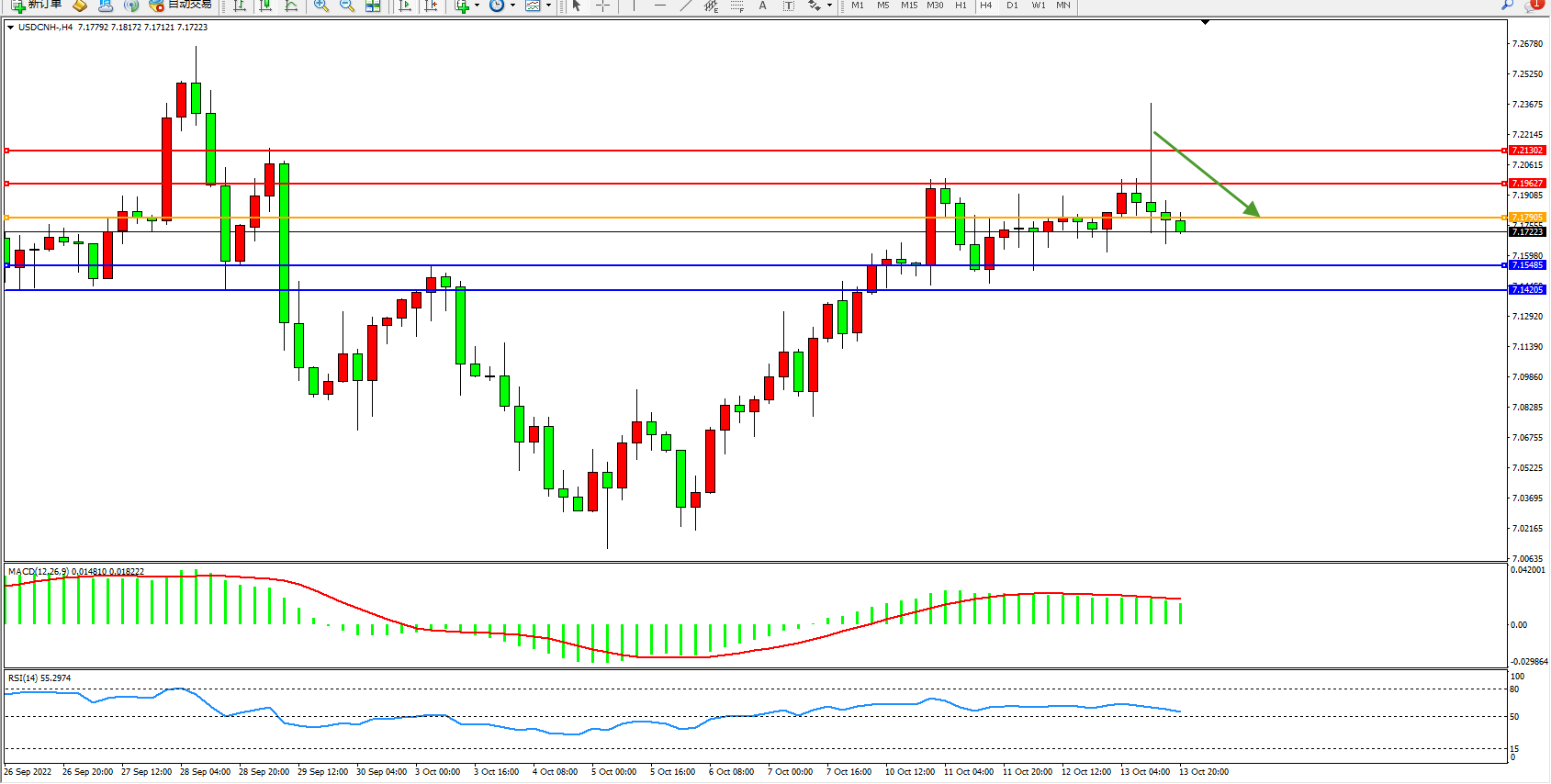 美元人民币USDCNH——4小时K线图显示: