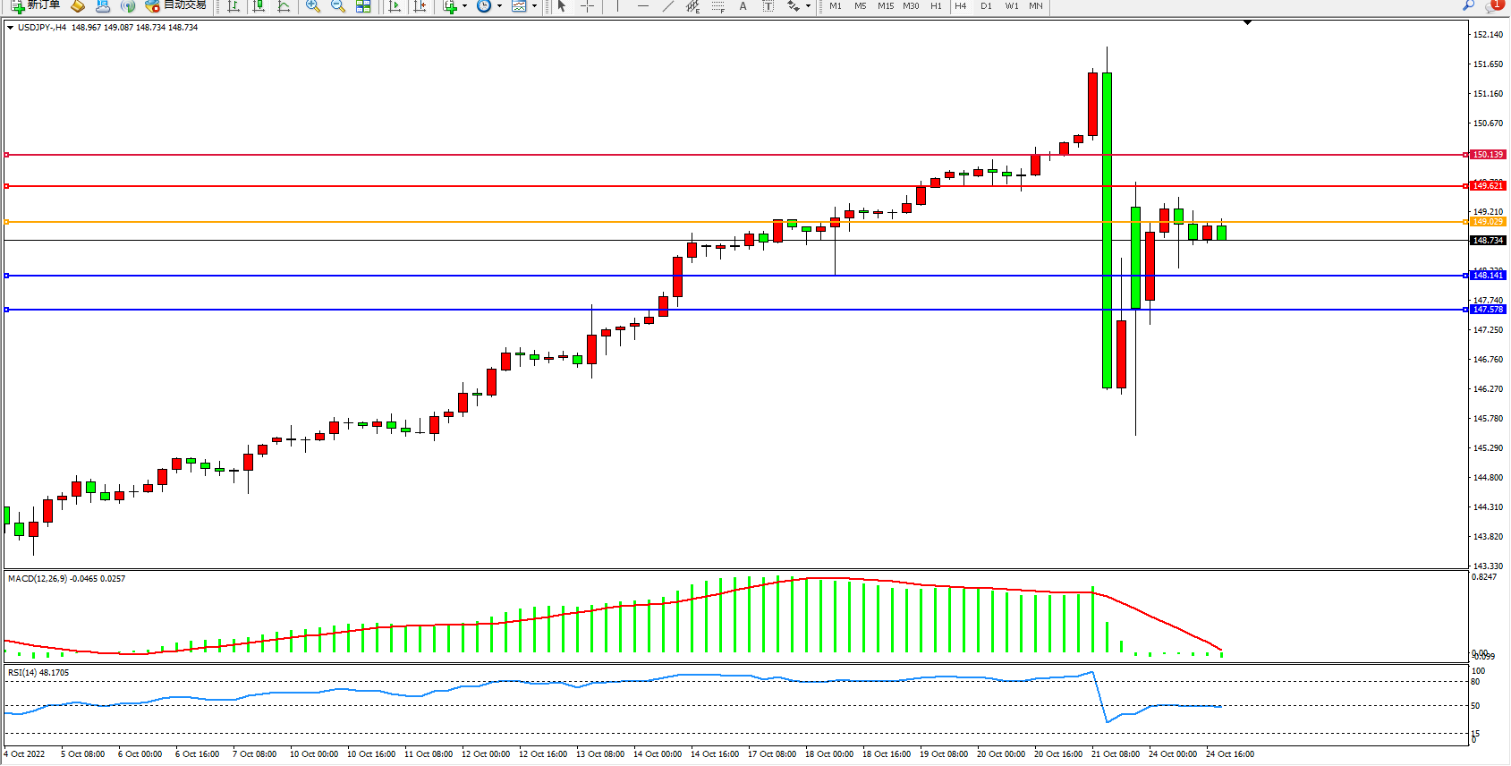美元日圆USDJPY——4小时K线图显示: