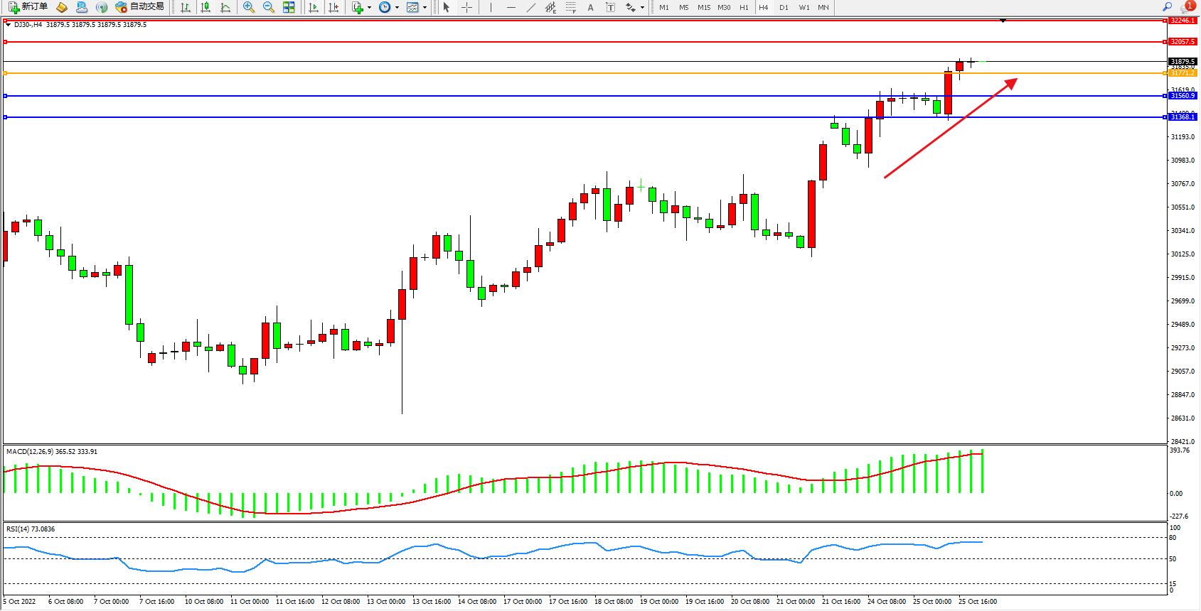 道琼斯指数DJ30——4小时K线图显示: