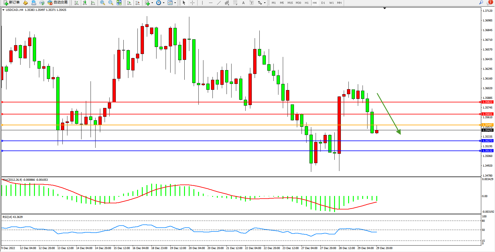 美元加元USDCAD——4小时K线图显示: