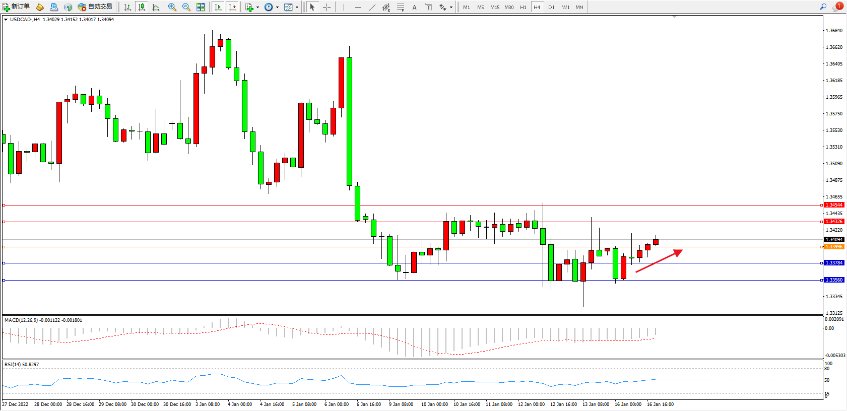 美元加元USDCAD——4小时K线图显示: