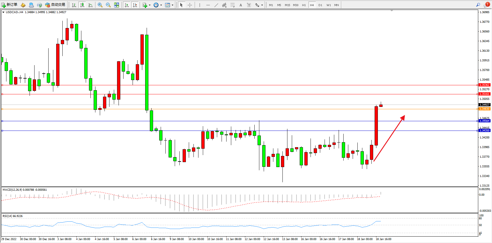 美元加元USDCAD——4小时K线图显示: