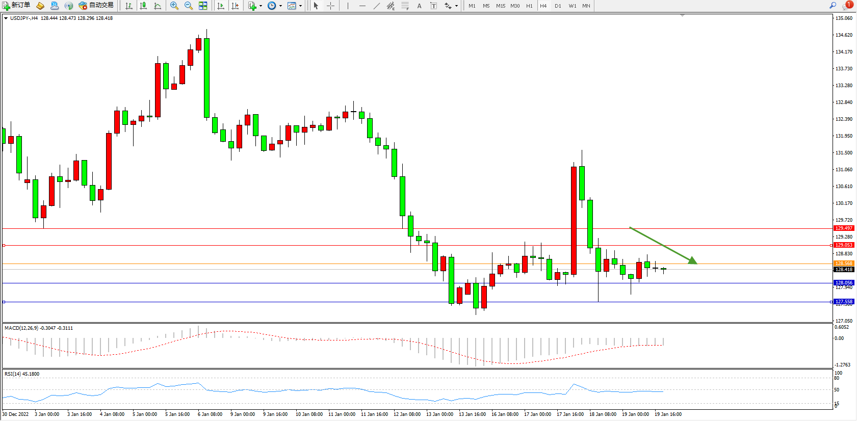 交易策略:128.568下方看跌,目标128.056、127.558