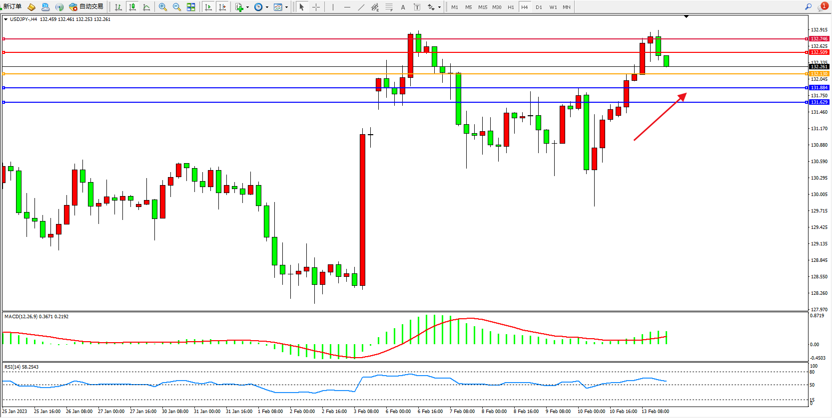 交易策略:132.130上方看涨,目标132.509、132.746