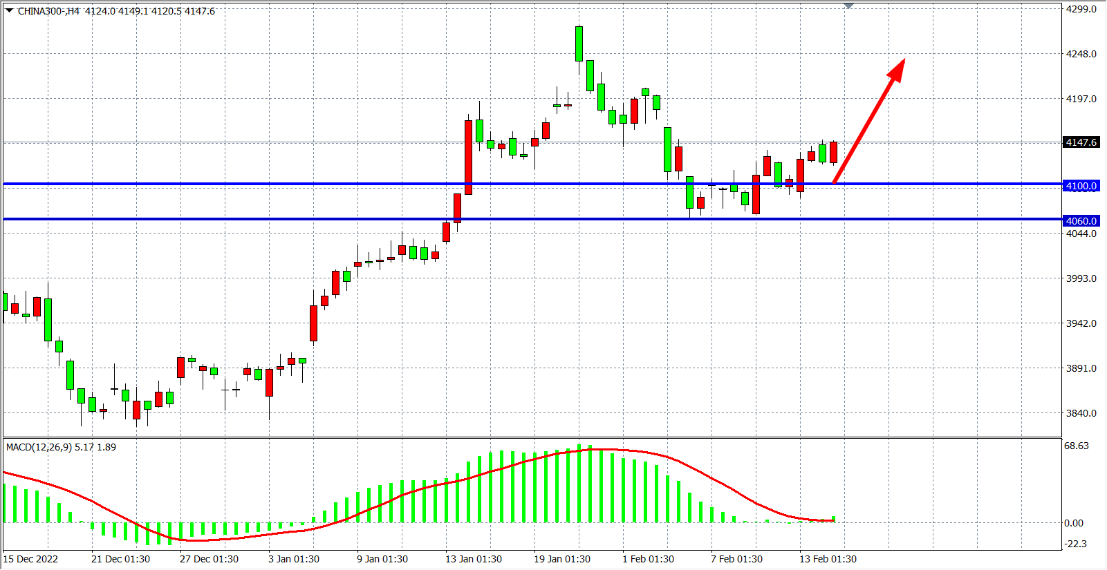 4小时图看,沪深300在4060之上继续小幅走高,同时MACD量能在零轴之上也出现小幅放量,预示行情有望回归涨势,当前支撑上移4100附近,上方看4200-4250。
