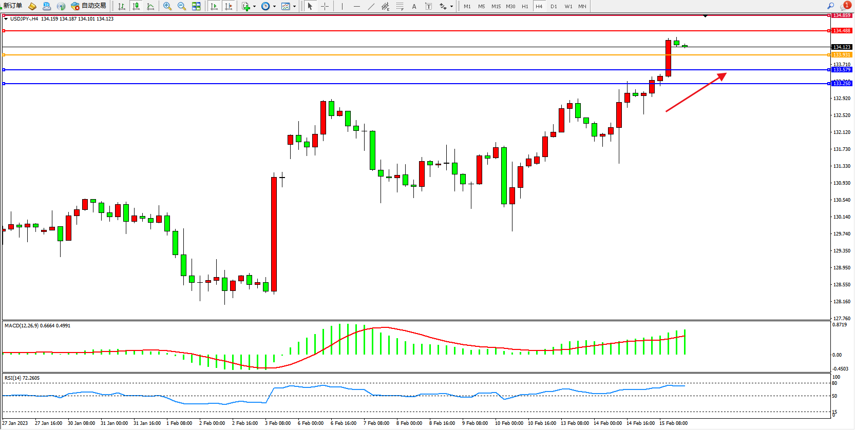 交易策略:133.931上方看涨,目标134.488、134.859