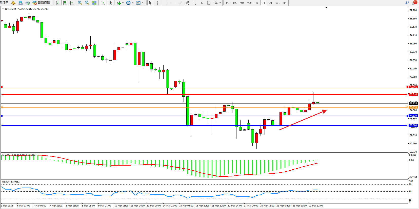 交易策略:75.233上方看涨,目标76.816  77.715