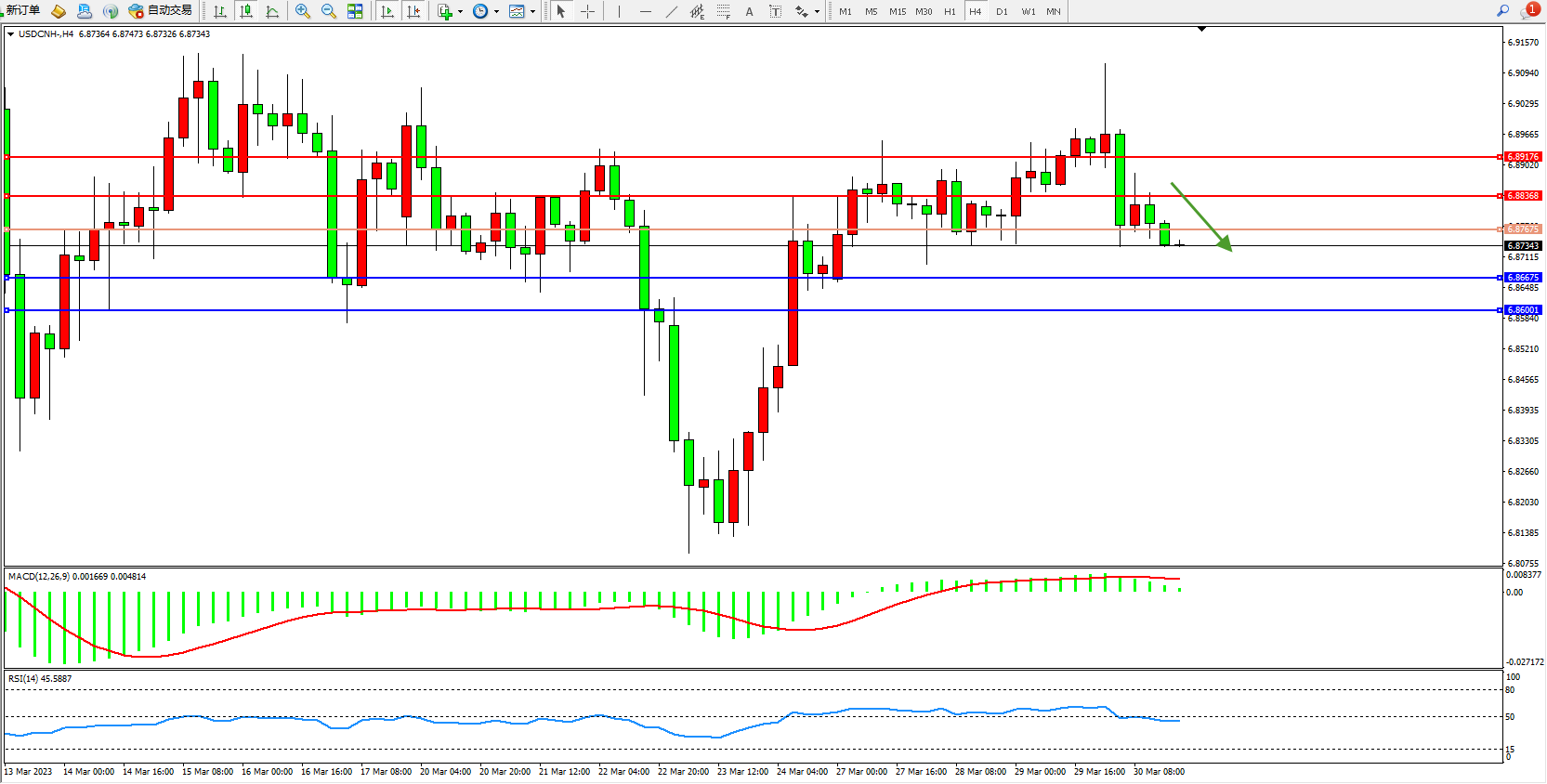 美元人民币USDCNH——4小时K线图显示: