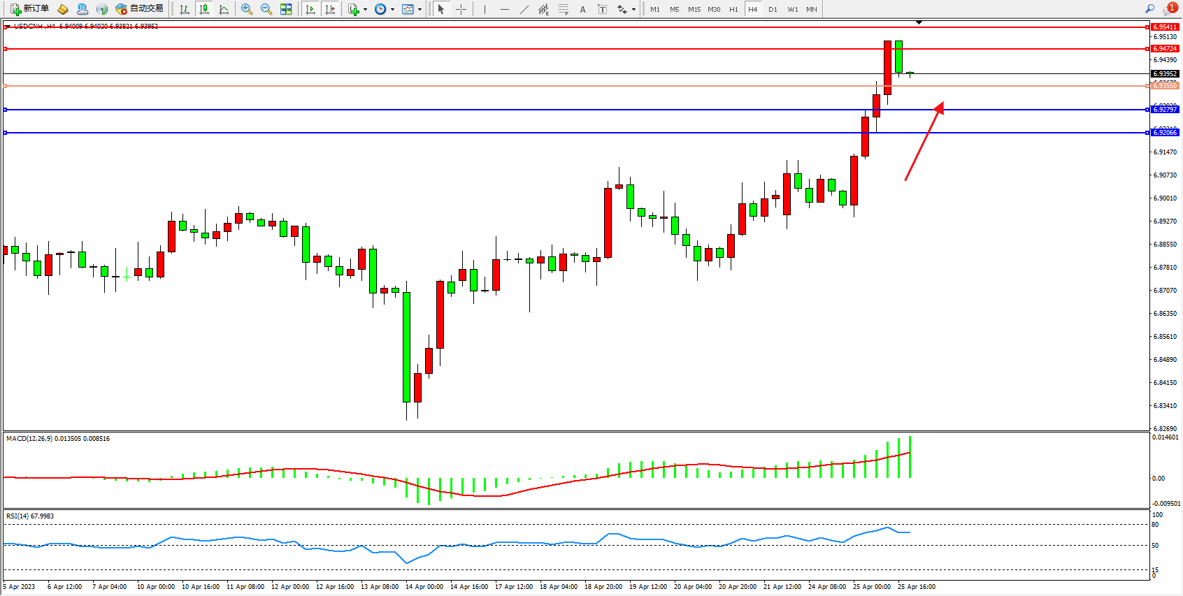 美元人民币USDCNH——4小时K线图显示: