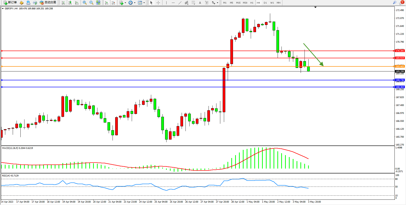 交易策略:169.469下方看跌,目标168.736 168.364