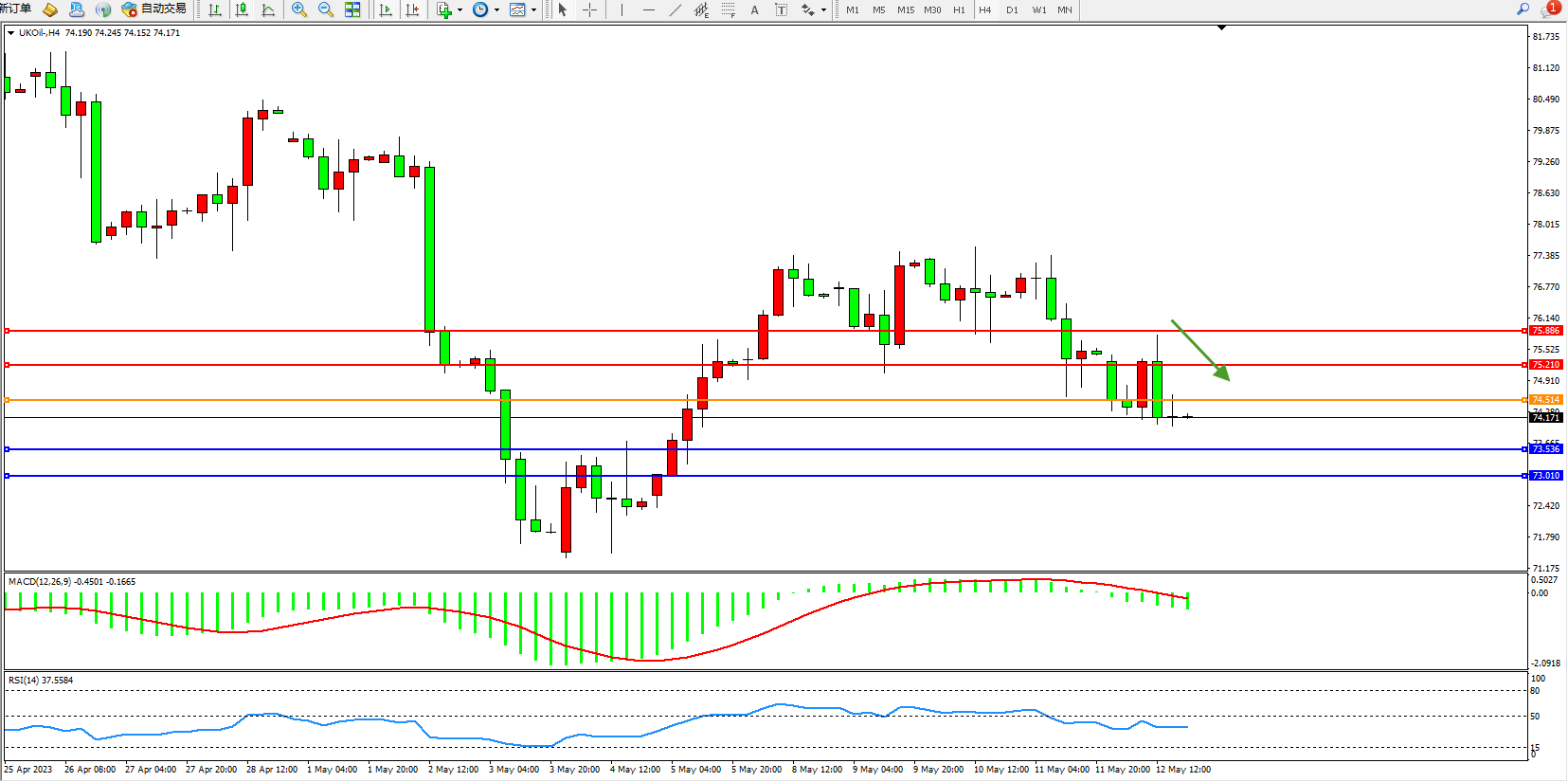 交易策略:74.514下方看跌,目标75.536  73.010