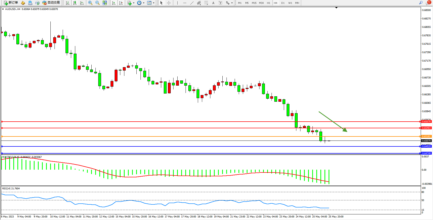 交易策略:0.65182下方看跌,目标0.64920  0.64740