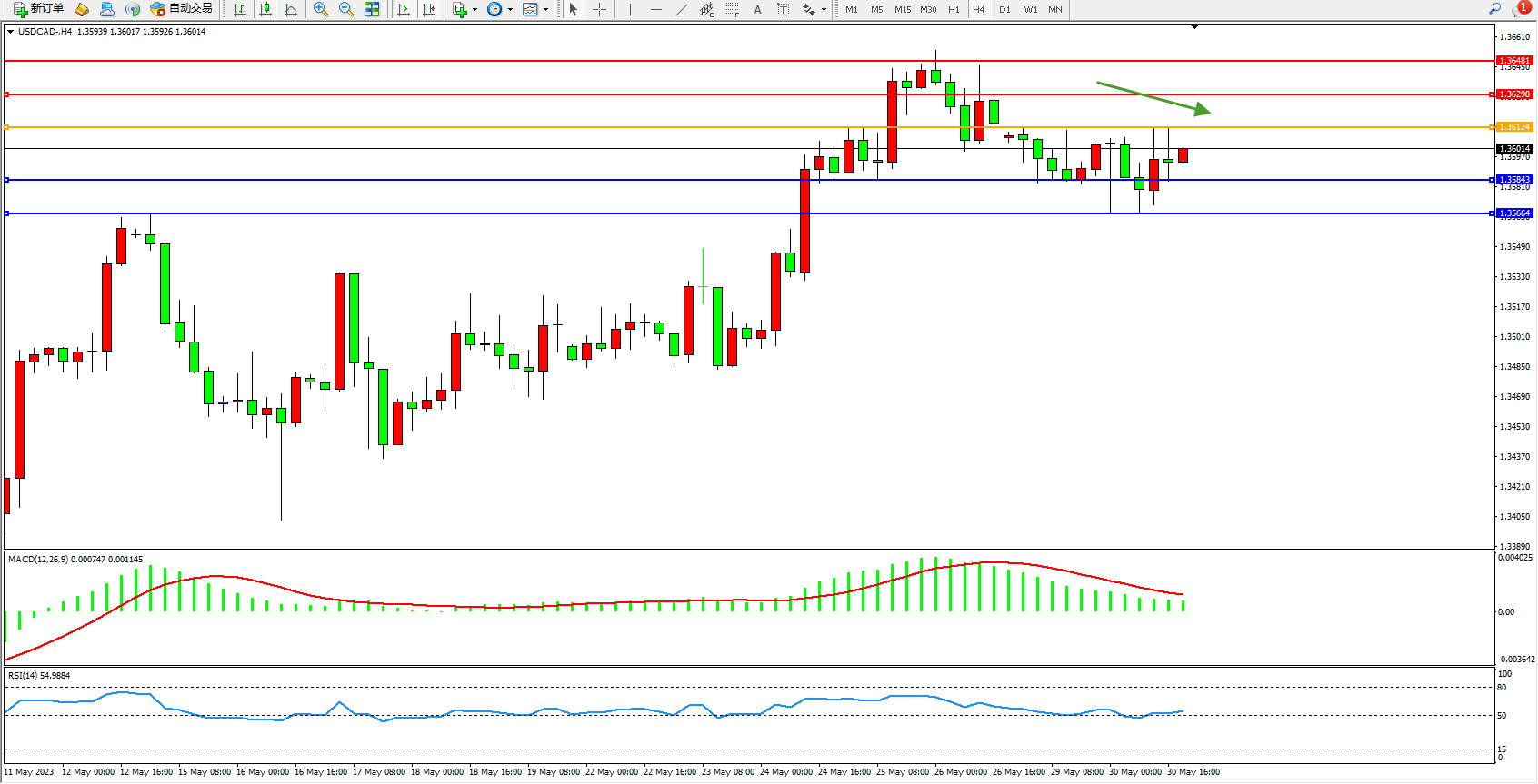 美元加元USDCAD——4小时K线图显示: