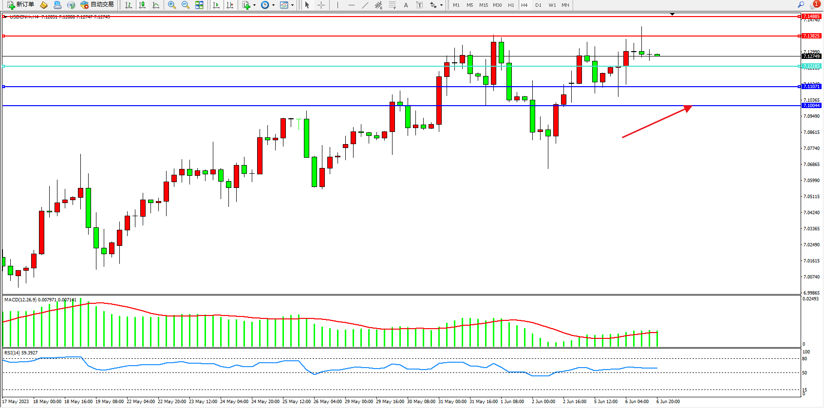 交易策略:7.12083上方看涨,目标7.13825 7.14885