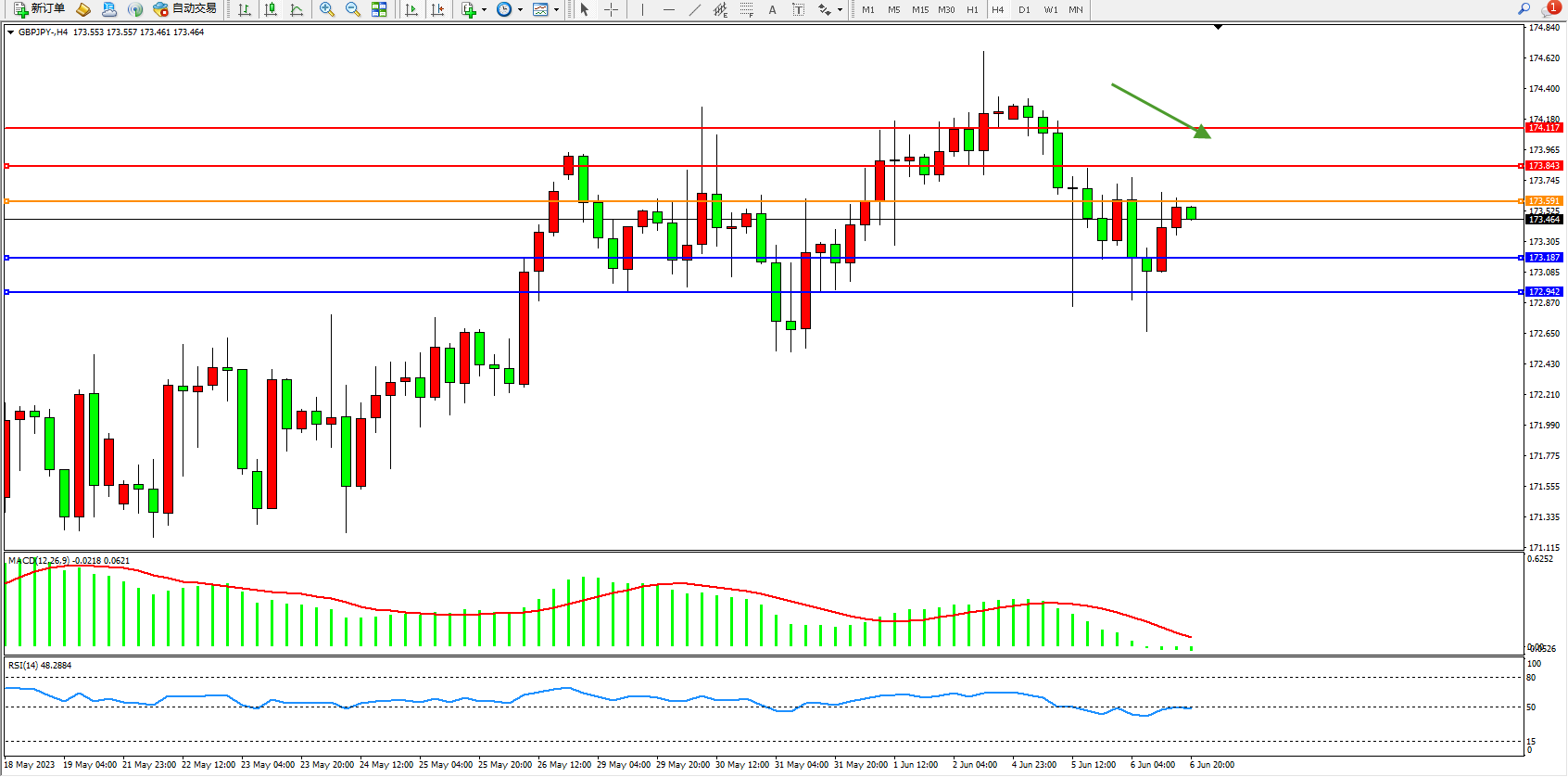 交易策略:173.591下方看跌,目标173.187 172.842