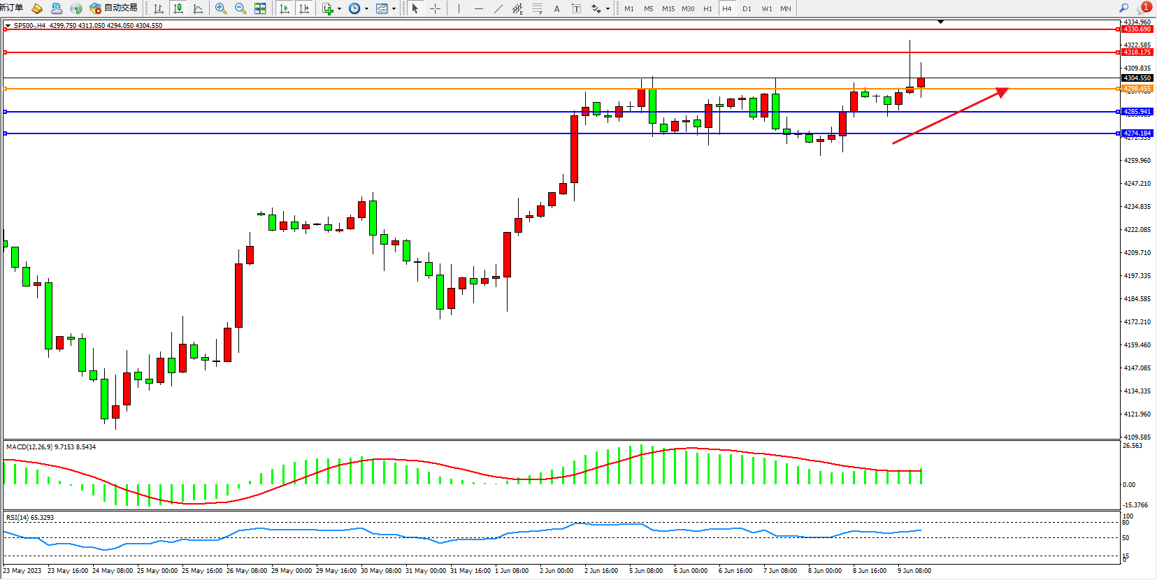 标普SP500——4小时K线图显示: