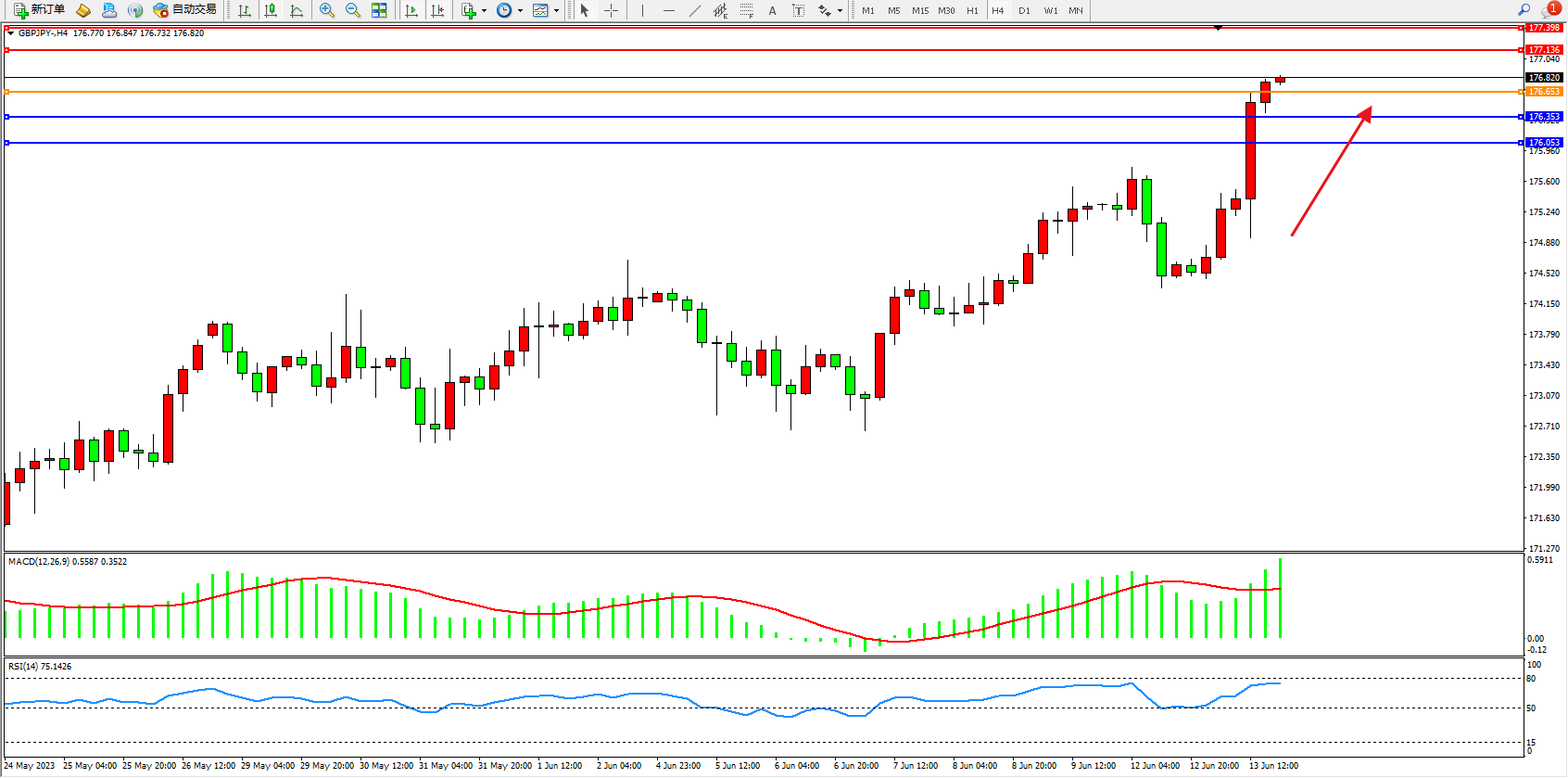 交易策略:176.653上方看涨,目标177.136 177.398