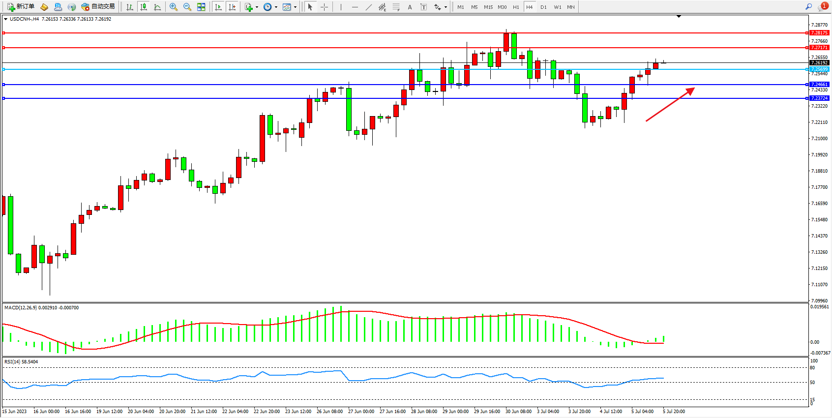 美元人民币USDCNH——4小时K线图显示: