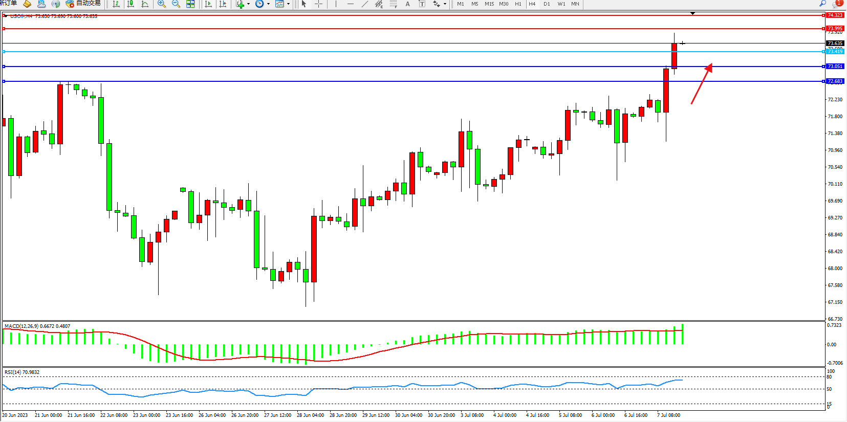 原油USOil——4小时K线图显示: