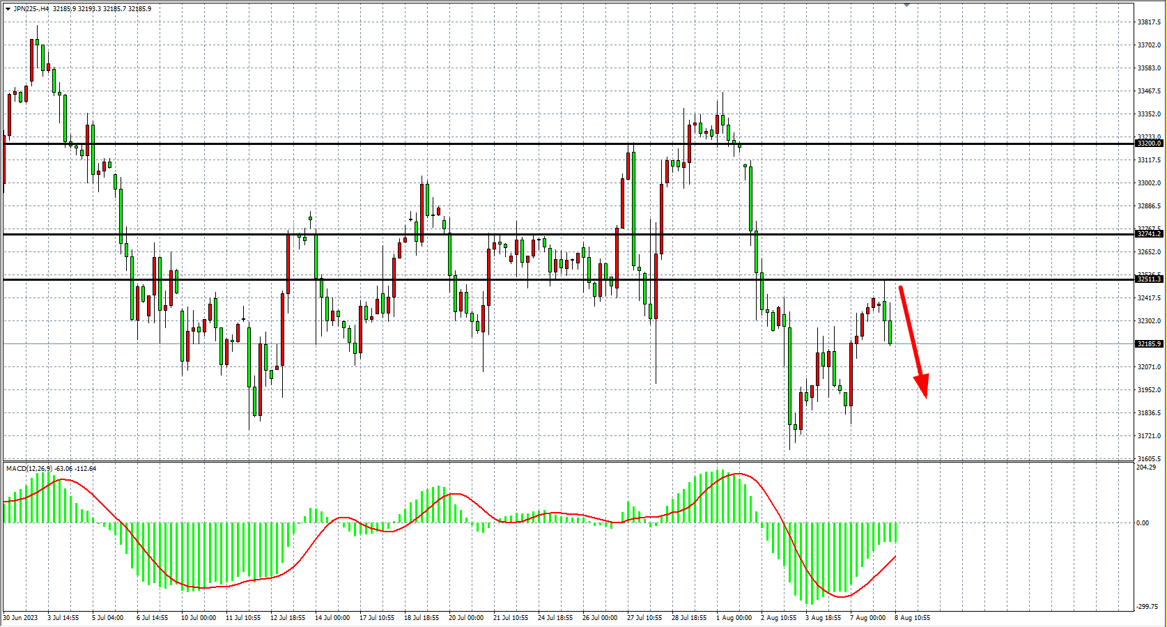 4小时图看,日经指数反弹再度受阻,MACD量能维持零轴下,趋势继续维持空头,阻力关注33250-32700。
