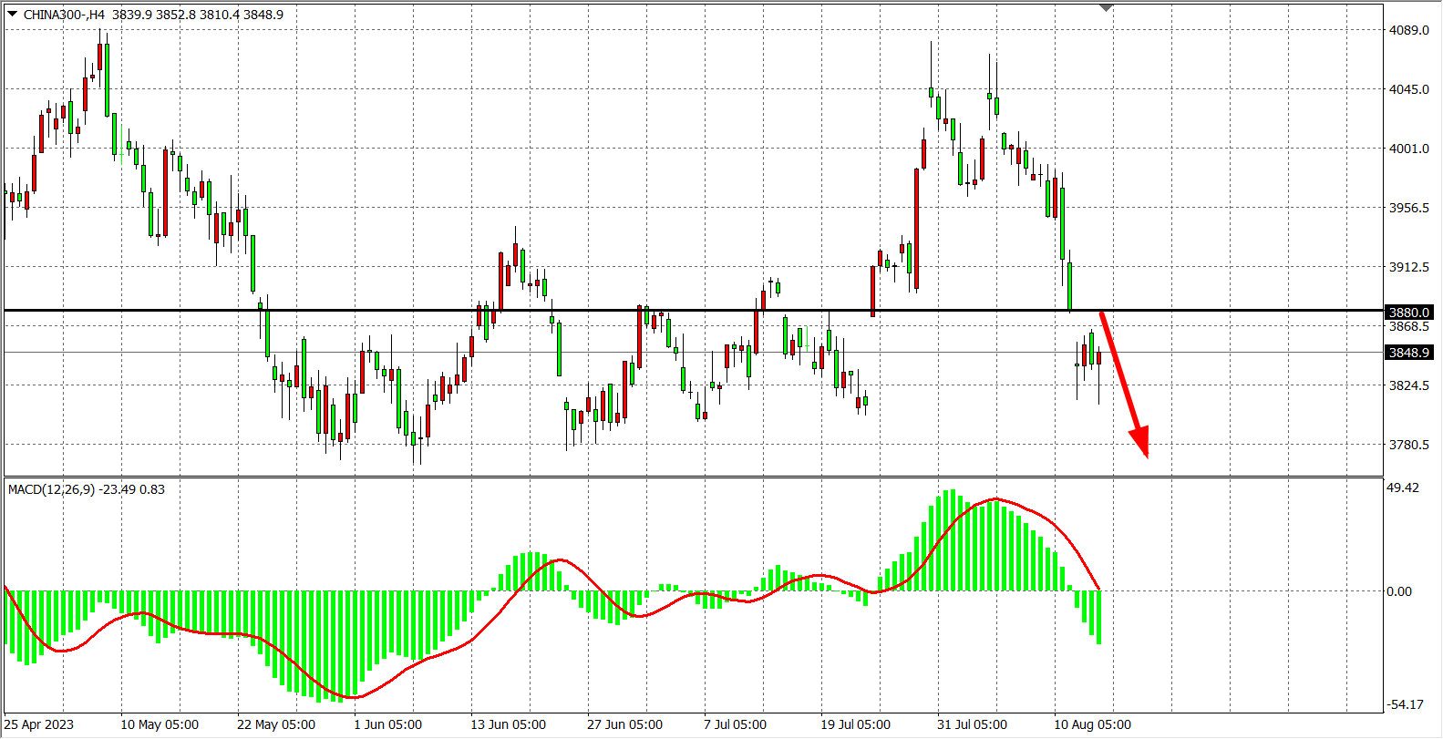 4小时图看,沪深300在3880之下运行,MACD量能在零轴下走强,压力继续关注3880附近,下方支撑关注3800-3770一线。