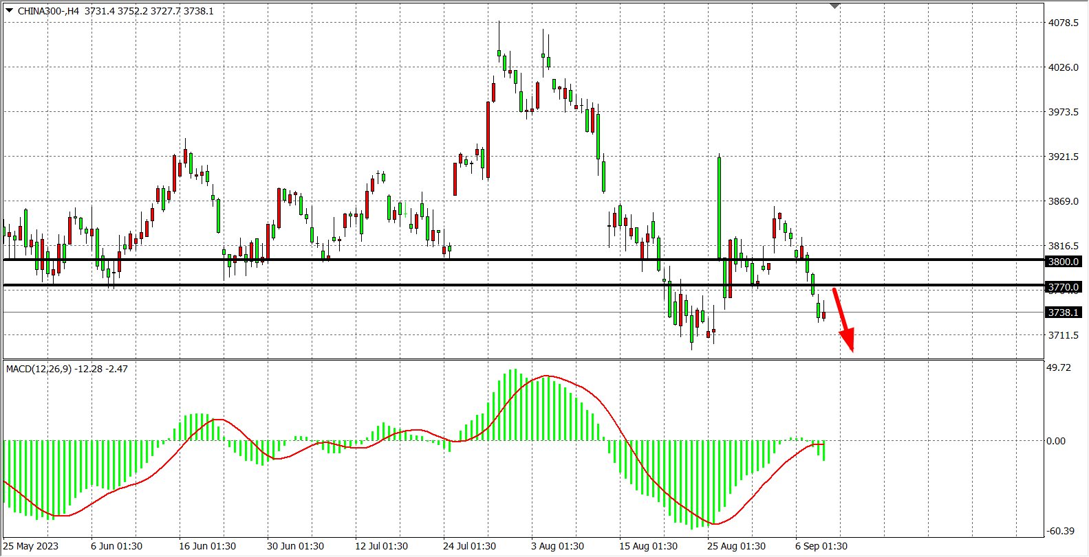 4小时图看,沪深300继续小幅下跌,MACD量能在零轴下重新放量,行情延续走空,阻力关注3770-3800附近,支撑关注3700-3670。
