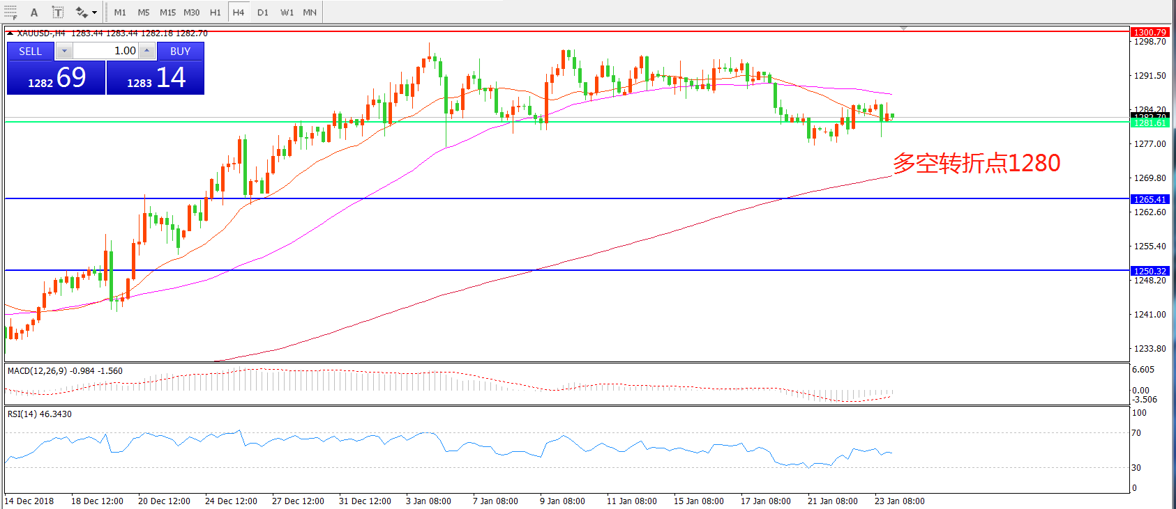 交易策略: 1280.00之下看跌,目标1265.00 1250.00