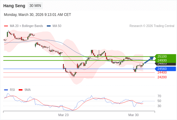恒生指数 当日内: 目标位为25100。