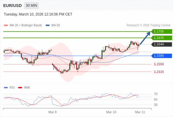 在 1.1590 之上,看涨,目标价位为 1.1675 ,然后为 1.1705 。