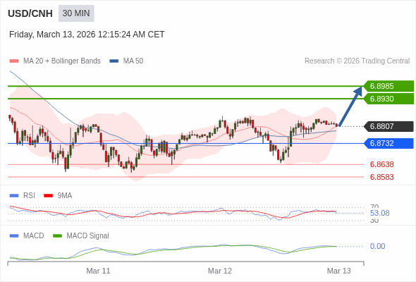 美元/人民币 当日内 : 看涨,当 6.8732 为支撑位,目标定在6.8985。