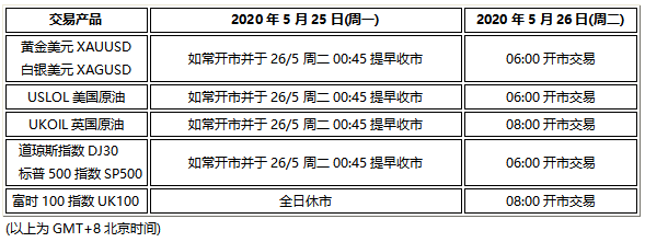 因应2020年5月25日(周一)为美国市场阵亡将士纪念日&英国市场春季银行假,以下产品的交易时间将于假期期间提前或全日休市,敬请阁下知悉留意。