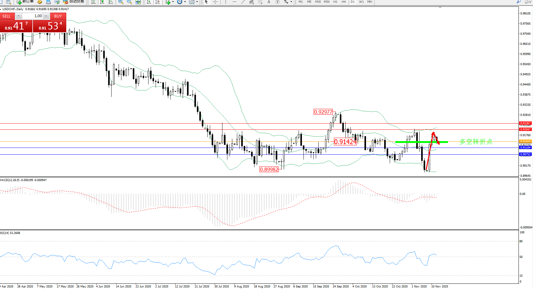 交易策略:0.91424上方看涨,目标0.92047、0.92367