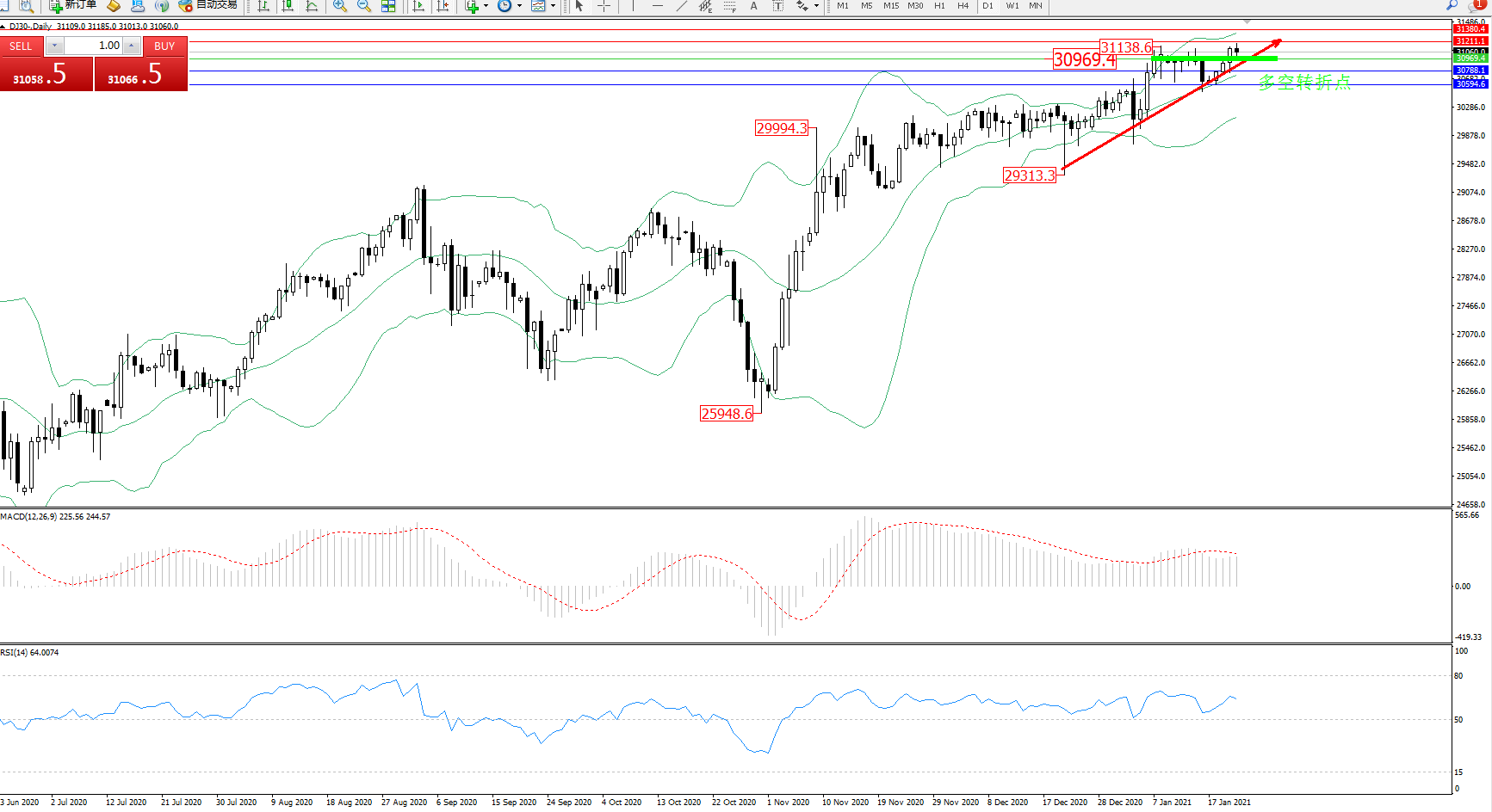 技术点评:多头动力延续布林带指标通道中上轨区间持续震荡上扬态势良好,高位抵达31138位置节点后遇阻开始短暂整理平移,触及中轨附近后再度向上移动,布林带指标呈张口走势后缓慢向上收口中,多头动力有继续向上移动走势,MACD指标处于0轴线上方多头区域维持整理平移中,RSI指标处于50均衡线上方多头区域持续弱势震荡中;
