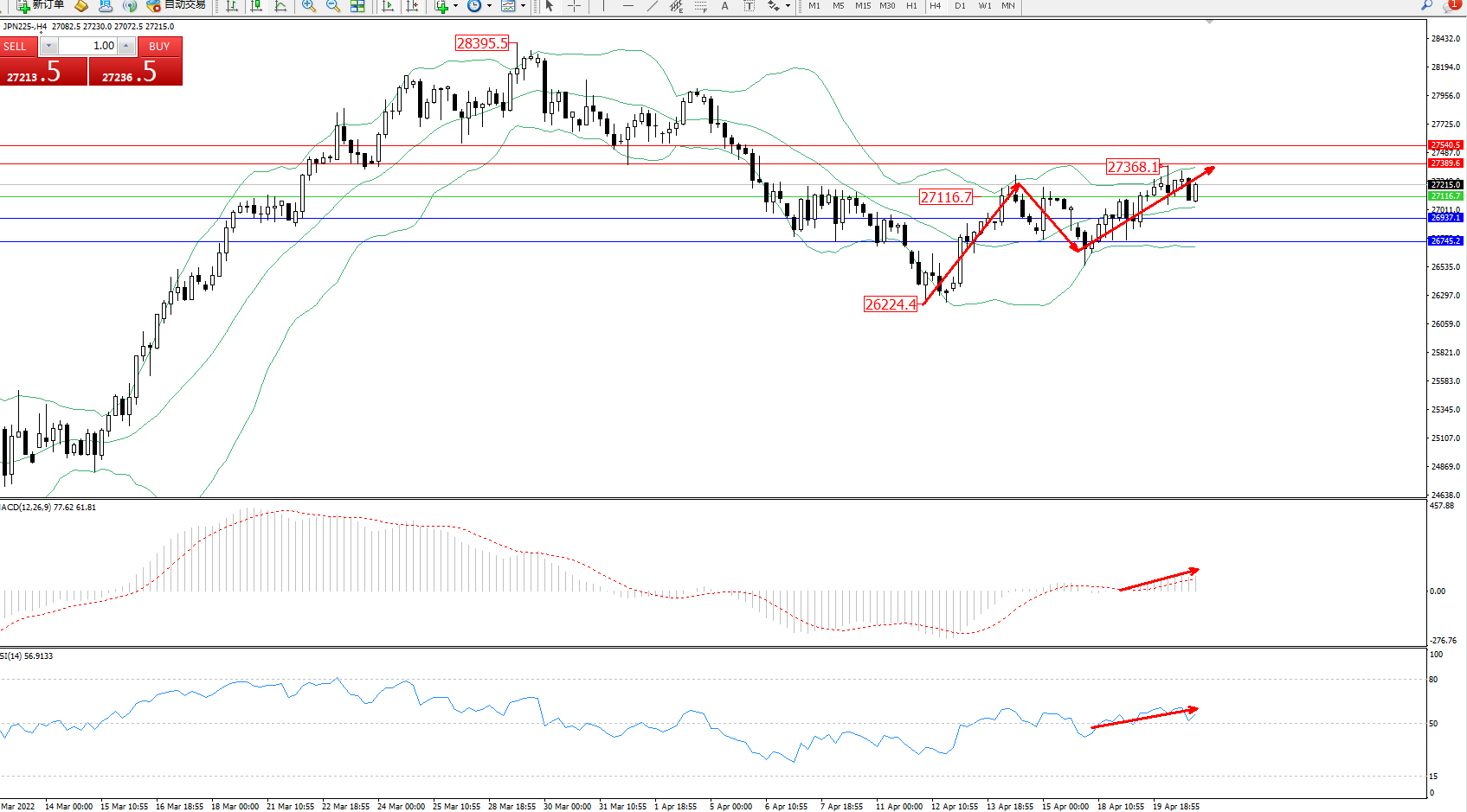 日经225指数4月20日(周三)收盘上涨241.91点,涨幅0.90%,报27227.00点。日本3月连续第八个月录得贸易逆差,因能源和大宗商品价格飙升提高了进口成本,在乌克兰危机之后加剧了经济痛楚。数据显示,出口增长低于预期,因为对主要贸易伙伴中国的出口增长放缓,表明全球供应限制和新冠疫情继续给日本经济带来风险。3月进口较上年同期飙升31.2%,增幅高于市场预测中值28.9%。这超过了出口的同比增长14.7%,导致贸易逆差为4124亿日元,高于预期的1008亿日元。虽然3月贸易收支连续第八个月录得逆差,但逆差规模为五个月来最小。