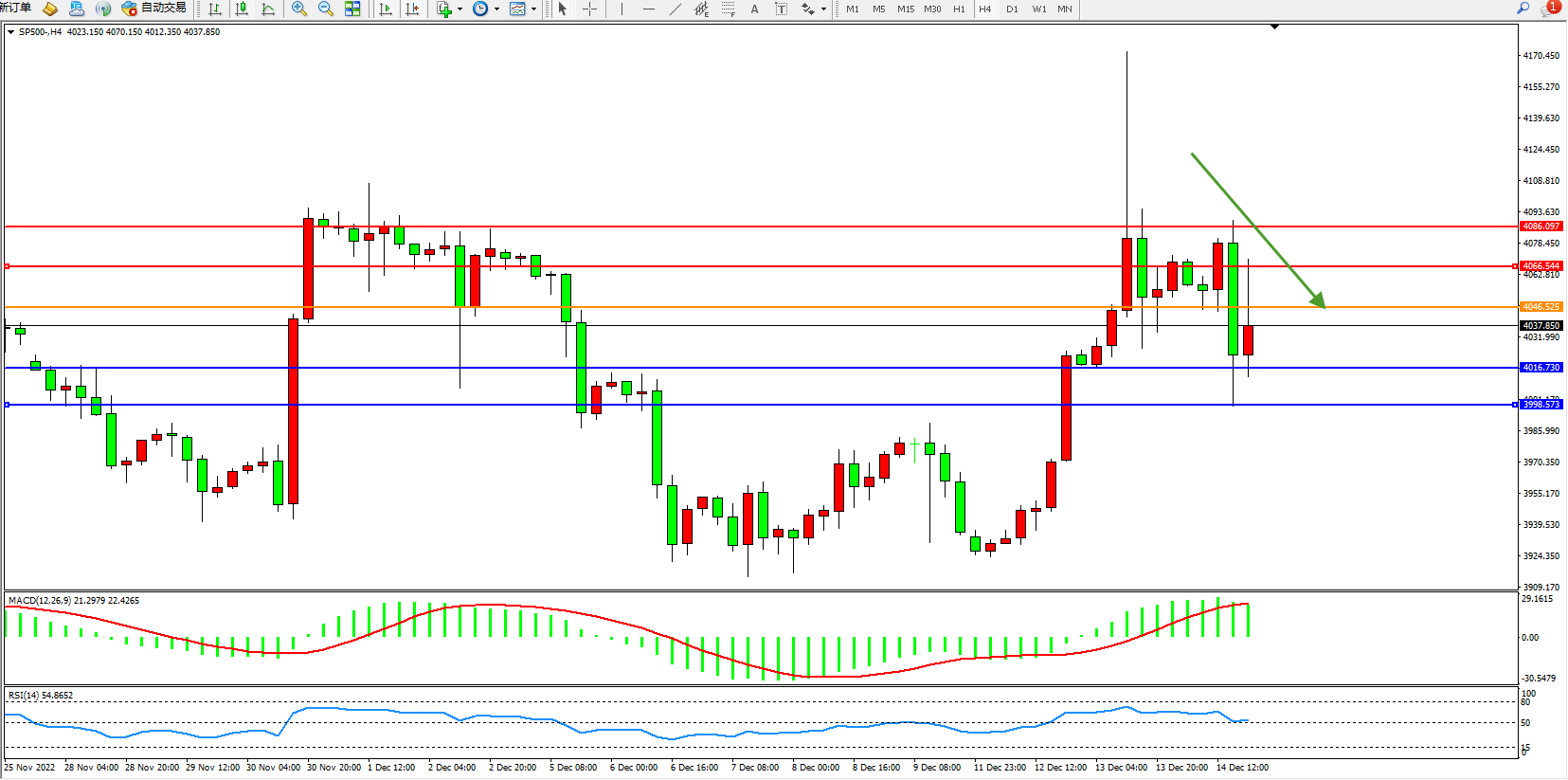 标普500指数12月14日(周三)收盘下跌24.65点,跌幅0.61%,报3995.00点;美联储上调通胀预期和利率中值预期。同时美联储仍然继续强调通胀风险。2023年点阵图利率预测聚集在5%以上,只有两个点位低于这一水平,表明FOMC成员站在同一立场上。