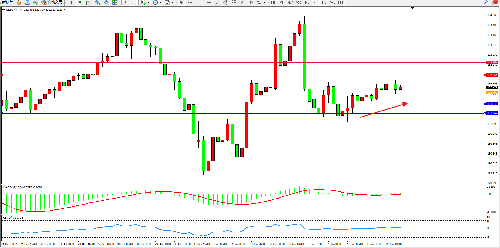 交易策略:132.295上方看涨,目标132.864、133.282