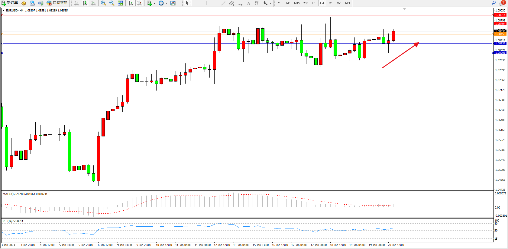 欧元美元EURUSD—4小时K线图显示: