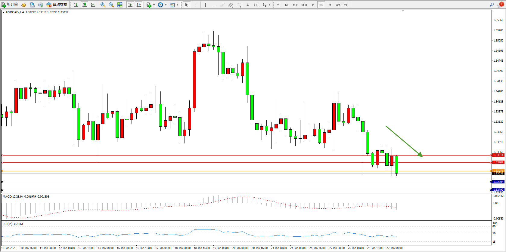 美元加元USDCAD——4小时K线图显示: