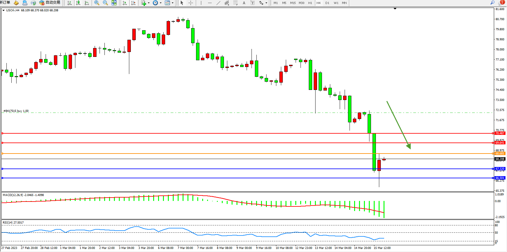 原油维持68.208附近震荡,美国至3月10日当周EIA原油库存 155万桶,预期118.8万桶,前值-169.4万桶。EIA俄克拉荷马州库欣原油库存 -191.6万桶,前值-89万桶。