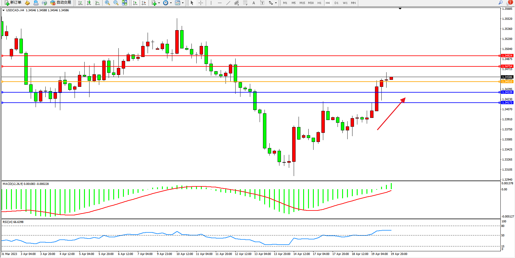 美元加元USDCAD——4小时K线图显示: