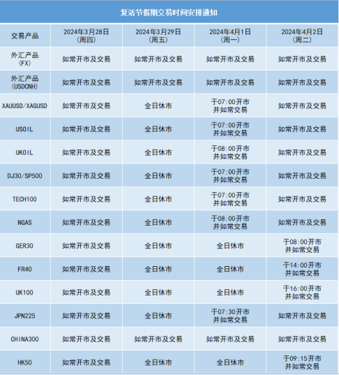 因应2024年3月29日(周五)为美国市场假期(复活节假期),本公司以下产品的交易时间将于假期期间作以下安排,敬请留意。