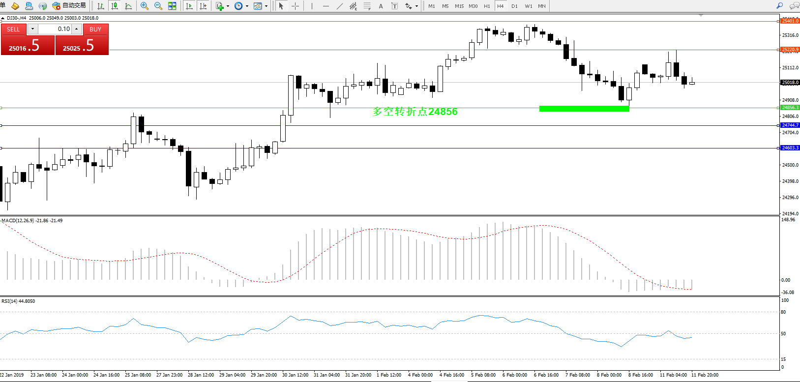 道琼斯指数DJ30—— 4小时K线图显示: